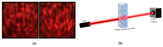 Next, the “basic” laser-based optical setup was used to measure the pure ethanol and the FEMP samples in another standard spectroscopic quartz cuvette with dimensions of 10 mm × 10 mm × 35 mm (ca. 3500 µL). The covered cuvette was shaken and illuminated with a Helium–Neon (HeNe) laser light source with a 0.81 mm beam diameter. The corresponding transmitted beam was also recorded with time on a CCD camera—also without an objective lens—placed 60 cm from the cuvette to determine the dynamic laser-light-scattering properties of the particles in the FEMP sample.