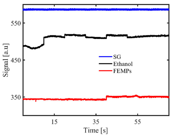 Figure 3 shows the reflection signal detected with the DOE-based sensor after introducing 15 μL of the FEMP sample on the smooth glass disk base. The recorded specular reflection signal had an accuracy of ca. 0.10%. We observe that both the pure ethanol and FEMP samples showed lower reflection signals than with the smooth glass only, with that of pure ethanol being higher than that of the FEMP sample. The clear difference in the magnitudes of the reflection signals between the pure ethanol and FEMP samples was more likely due to the difference in the refractive indexes of the two samples. Pure ethanol has a refractive index (RI) of n = 1.36; by preserving the filtrated sample in ethanol, we changed the effective refractive index of the resultant mixture, which yielded a change in the reflection signal. Obtaining a lower reflection signal than that of pure ethanol indicates that the FEMP sample had a higher effective RI than the pure ethanol. However, we note that, by measuring the specular reflection of such a small volume on the smooth glass, we obtained information on the ambient medium of the FEMP sample rather than on the MPs, the reason being that such a small volume of the FEMP sample has very little probability of containing an MP, although it may contain other particles (see Figure 1) that also affect the effective RI. Additionally, considering the fairly constant nature of the reflection signal with time, one can conclude that both liquids rarely spread over the smooth glass [22,30]. This is especially true for the FEMP sample due to its slightly more viscous nature than that of the pure ethanol.