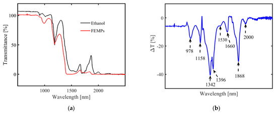 Transmission spectra of (a) pure ethanol (black curve) and the FEMP (MPs preserved in ethanol, red curve) samples and (b) differences between the two spectra (ΔT).