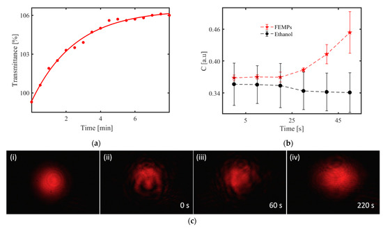 The images in Figure 5c were obtained using the optical setup described in Figure 2b. Figure 5c shows static images related to similar measurements, but using the HeNe laser beam and a 10 mm cuvette. In Figure 5c (i), the pattern recorded for pure ethanol, which was stable for various durations, is shown. We observe regular and symmetric annular interference fringes, which could result from the thermo-optic properties of ethanol and the Gaussian intensity profile of the HeNe laser [32,33,34]. The presence of the annular rings serves as a measure of the extent of distortion of the incident beam by the FEMP sample. Figure 5c (ii) and (iii), on the other hand, show an obviously distorted beam even after 60 s of shaking the cuvette. The distortion of the beam evolves with time. The pattern, however, becomes steady after 220 s, as shown in Figure 5c (iv) with secondary circular rings. Although the macroscopic patterns in Figure 5c (i) and (iv) resemble each other, we assume that the haziness is due to the scattering of light from small particles—possibly micrometer-sized MPs. The patterns taken at 0 and 60 s show that the beam interacted with some particles, which we attribute to the MPs due to the low concentration of the organic matter present in the FEMP sample.