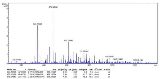 High-resolution electrospray ionization mass spectrometry of PF-1-Cu samples was acquired using a Bruker Apex IV FTMS (Bruker Inc., Bremen, Germany). It was shown that the modified resin mostly varied from 343 to 615 g/mol. This means that the modified resin exhibited low molecular weight, which aided in better penetration into the wood cell walls.