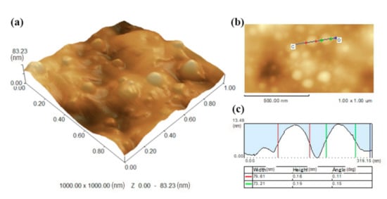The sample surfaces of the nano-copper particles were performed with an AFM (Multimode 8, Bruker Inc., Santa Barbara, CA, USA) under PF-QNM imaging mode. The surface topography of the PF-1-Cu was recorded over an area of 1 × 1 μm2 in tapping mode, at a high resolution with a sharp silicon tip (0.5 N/m). The two-dimensional (2D) and three-dimensional (3D) images were obtained at the room temperature (24 ± 1 °C).