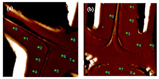 Nanoindentation images of Chinese fir marked with measurement location. (a) control sample, (b) PF-1-Cu sample.