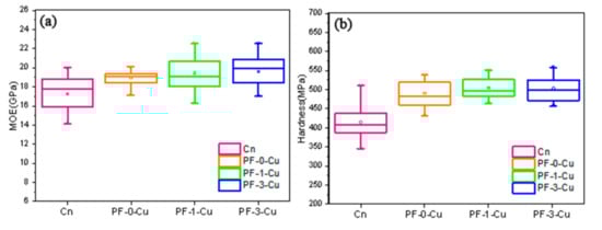 According to the literature, it can be inferred that the modified PF resin diffused into the nanopores of the wood cell walls and form crosslinked networks, improving the mechanical properties of wood [33]. In the current experiment, the mechanical properties of the wood cell walls were improved through physical and chemical modification. It was further confirmed that nano-copper-modified low molecular weight PF could be evenly distributed in the cell walls and enhanced the mechanical properties of the cell walls. Furthermore, the increase in NI hardness was significantly more than the increase of NI MOE, which was attributed to the lower MOE and higher hardness of the modified PF resin polymers [34]. In addition, the average values of the NI MOE and hardness values of PF-1-Cu and PF-3-Cu samples were similar, which is likely, because the PF resin with 1 wt% nano-copper to modified Chinese fir is better than the latter. The reason was that the low content of nano-copper not only economically saves materials, but also prevents the agglomeration of nano-copper.