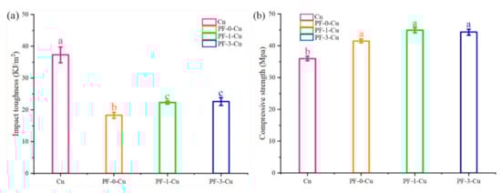 Mechanical properties of the control, PF-0-Cu, PF-1-Cu, and PF-3-Cu samples. (a) impact toughness, (b) compressive strength.