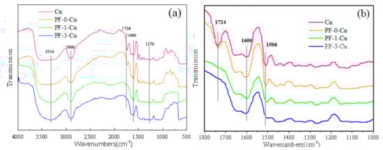 FTIR spectra of the control (a), PF-0-Cu, PF-1-Cu, and PF-3-Cu samples (b).