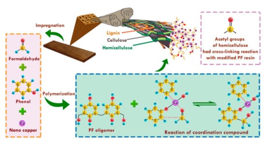 The surface atomic coordination of nano-copper particles is insufficient at high surface energy and chemical activity. Nano-copper particles can easily react with hydroxyl groups in the PF resin to form metal complexes, block the hydroxyl groups, and increase the chemical stability of the PF resin. It has been speculated that the structure of the coordination compound with copper nanoparticles and PF resin may crosslink with the acetyl groups of hemicelluloses [23,43] (Figure 10). Therefore, under the interactions of Chinese fir, PF resin, and nano-copper, the physical properties of Chinese fir were considerably improved. This modified Chinese fir can be utilized in outdoor buildings and furniture.