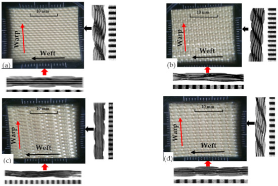Top view and side sectional micrographs of the different 3D warp interlock variants (a) 8/0, (b) 8/4, (c) 8/8, and (d) 4/8.