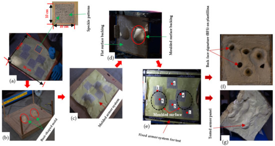 The backing material (plastillina) box was chosen based on NIJ standard recommendations and prepared with the flat inverted form of a bust-shaped mould (Figure 2c) to accommodate the formed armour system (Figure 2d) and fixed to the backing with the narrow fabrics on the four edges (Figure 2e). It was then firmly attached to the mainframe before ballistic impact testing. After the test, the required data to investigate the different ballistic performance analysis could be then extracted from the backing materials and tested armour panel as shown in Figure 2f,g respectively.