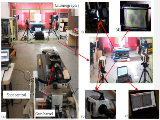 Ballistic testing facility: (a) the whole set-up, (b) high-speed camera, (c) computer system to synchronize the bullet and the high-speed camera recording, (d) armour panel system for testing and (e) high-voltage lighting system.
