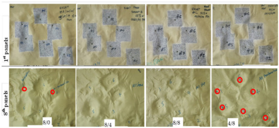 The number of panels at which the bullet stopped while testing the 3D warp interlocks fabrics considering various shot points was computed. Regardless of the penetration level of the bullet, the number of panels where the bullet trapped was considered for better understanding and comparisons. The armour system was made of the four variants of the 3D warp interlock fabrics which are made of different bindings: the stuffer ratios were considered for analysis. However, since armour system 4/8 was penetrated in all shot points and armour system 8/0 in two shots (one and four shot points), the values in the specific positions were excluded while discussing the projectile arresting panels and their postmortem analysis. Figure 4 shows the pictures of the striking faces of the 1st and 8th panels of the different armour systems at various shot points.
