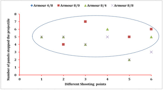 On the other hand, panels 4 and 2 were accountable for arresting the projectile in the mentioned two armour systems at shot points 3 and 5, respectively. Armour system 8/8 uses a lesser number of panels to stop the projectile at shot points 4 and 6 as compared to the armour panels of 8/4. Besides, the armour panels of variant 8/0, except shot point two, involved a higher number of fabric panels in the projectile arresting mechanism than the armour systems of 8/4 and 8/8.