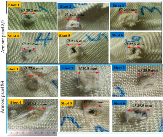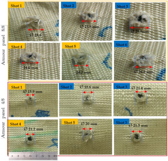 Such yarn straightening and higher tension might causes the opening of the crimp and then allows the projectile to easily penetrate into the armour panel. Based on this, the average damage diameters of moulded and nonmoulded areas for armour panels 8/0 were Ø20.98 and Ø22.13 mm, respectively. Besides, 8/4, 8/8, 4/8 recorded an average damage diameter of Ø24.13, Ø24.06 and Ø19.03 mm, respectively, at the moulded, and Ø28.5, Ø26.76 and Ø20.43 at the nonmoulded areas, respectively.