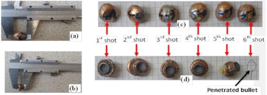 The different trapped projectiles were also carefully collected, and their length and diameter measured for the postmortem analysis of projectile deformations. Some of the projectiles trapped at various shot points by different panels are shown in Figure 5.