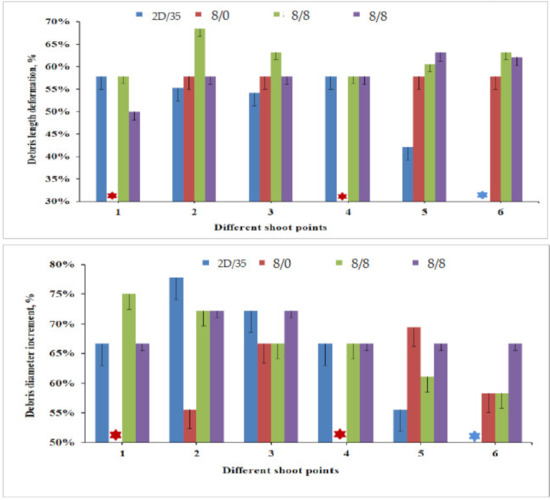 The residual projectile debris deformational percentage for armour panels at various shot points. All shots penetrated for armour panel (4/8), armour panel (8/0) penetrated at shots 1 and 4 (*)).