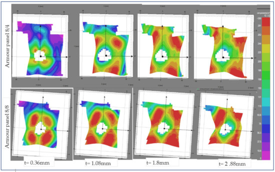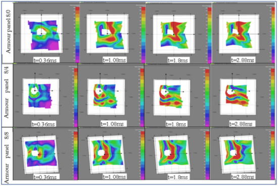 Interestingly, similar trends of the wave propagations were observed within the same armour system panels as time after impact went further from 0.36 ms to 2.88 ms. However, the wave propagation trends and their effect on the panels’ surface displacements were realized in different directions among the armour systems. For example, the wave propagations in the panel surface of armour panel 8/0 seem well concentrated in certain areas near the local impact points and contours of the penetrated panel. Besides, the local displacements were found well distributed both in the weft (horizontal) and warp (vertical) directions. On the contrary, the higher surface displacement by the wave propagations of armour panel 8/4 through time was distributed in different regions both near to and away from the impact points. The high surface displacements of this panel were seen along the weft (horizontal) directions. As shown in Figure 11, armour panel 8/8 also shows its own high displacement value location and direction. In this panel, similar to armour panel 8/0, the high strain was more concentrated around the local impact point but propagated with different intensities in the warp direction (vertical) as time passed.