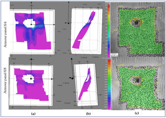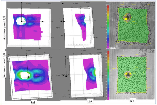 Surface displacement of frontal armour panel at impact times of 3.6 ms (a), (b), 3D frontal and side views of stereoscopic images, respectively, and (c) frontal panel images at shot point 5.