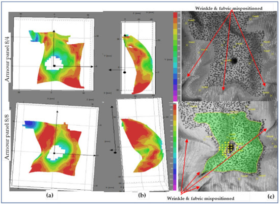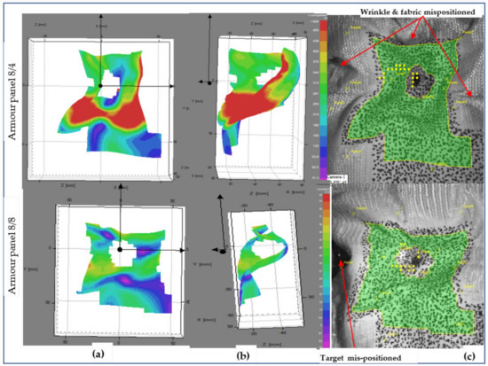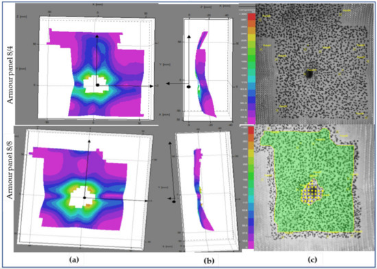 Besides, global failures in the form of fabric wrinkling, shrinkage and mispositioning of the target in all directions were observed, as shown in the fabric images. On the contrary, armour system 8/8 revealed uniform distributions of the wave propagation with lower surface displacement values throughout the impacted local areas. In the global response, it also shows less fabric surface wrinkling but faces misposition of the target on the right sides Similarly, Figure 17 also displays the deformed armour panel (8/4 and 8/8) images with the time (t = 3.6 ms) after impact at shot point 3. Based on the stereoscopic image observations of the panel at the specific impact time and locations, both armour system types suffered from a huge amount of surface displacement as the impact wave propagated. However, each armour system panel tends to create displacements in a specific but different direction while resisting the ballistic impact. For example, in the armour panel 8/4, a higher surface displacement with different layers along the weft (horizontal) direction near the impact position and far edges of the impact positions were observed. Similarly, the other armour system, 8/8, also revealed a patterned surface displacement but was distorted along the warp (vertical) directions, mostly near to the impact points. Even though 8/8 shows higher values than 8/4, both armour systems show fewer values not only for global surface displacement but also for wrinkling and mispositions of the target at shot point 3 compared to shot point 1, as shown in fabric photographs. The local, global surface displacements and the other failure modes of the two armour systems were also observed at the impact position of the moulded area, shot point 5. This helps us to provide a better understanding of the effect of the impact position in terms of surface displacement and other failure modes.