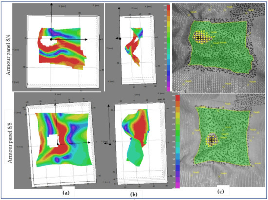 Figure 13, Figure 14 and Figure 15 show the surface displacements of the frontal planar and 3D steareoscopic and fabric panal images of the armour panels 8/8 and 8/4 with their local displacement at 0.18 ms after impact at shot points 1, 3 and 5, respectively. Based on the high-speed camera images, the surface displacement was initiated at t ≈ 0.180 ms after impact by the projectile wave for the mentioned tests. This is the reason why we consider t = 0.18 ms for the start of the impact to observe the different impacted armour systems. The armour systems were presented in the front and side views with the stereoscopic fabrics’ images. Figure 13 shows the deformed armour panels (8/4 and 8/8) with surface displacement at the instant (t = 0.18 ms) at shot 1. According to the observations, both armour systems show surface displacement on the panel; however, armour panel 8/4 involved a higher number of primary yarns in both directions as compared to armour panel 8/8 at the specified impact time.