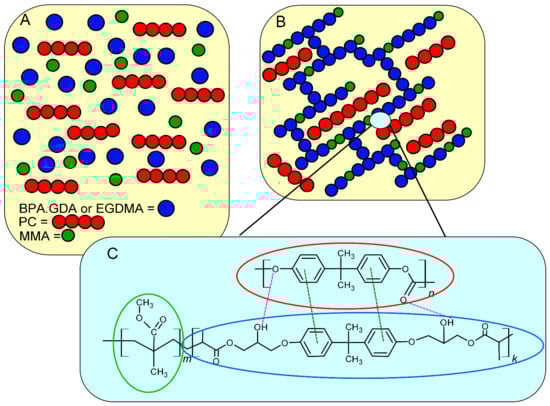 The BPA.GDA + MMA + PC and EGDMA + MMA + PC blends were prepared using the photopolymerization technique. An appropriate amount of active solvent MMA (methyl methacrylate) was added to the monomer (BPA.GDA or EGDMA) at the wt.% ratio of 3:7. The monomers were stirred at room temperature until a homogenous solution was obtained. Then, the PC solutions were carefully introduced. After addition, the polymer (PC) was dissolved in CH2Cl2 (2 h, room temperature). The whole content was stirred to obtain a homogeneous mixture and next put into the oven in order to evaporate the solvent (for 20 min in 30 °C). Finally, the calculated amount of UV initiator (2% w/w) (Irqacure® 651) was added to the sample. The contents of the beaker was poured into glass molds (10 mm × 8 mm × 2 mm) and polymerized under a UV lamp for 40 min. The samples were heated at 80 °C for 30 min after taking them out from under UV lamps. The detailed information regarding reagents and their amounts is presented in Table 1. The proposed scheme of polymeric blends structure is presented in Figure 2.