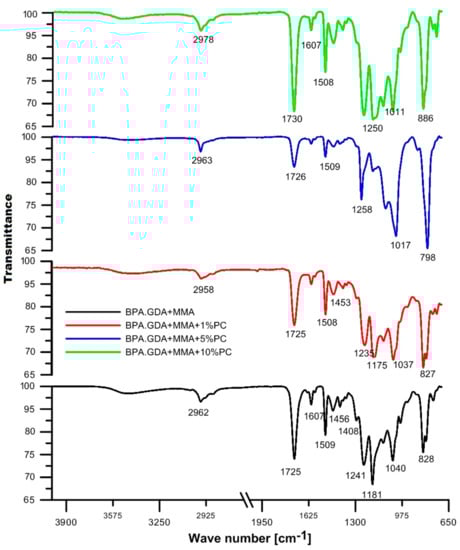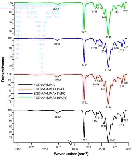 The ATR/FT-IR spectra of EGDMA + MMA blends are presented in Figure 4. The copolymer EGDMA + MMA + 5% PC shows the highest absorbance intensity. The rest of the spectra are practically identical. When comparing the BPA.GDA + MMA spectrum with EGDMA + MMA, vibrations originating from C–H aliphatic –CH2 and –CH3 groups, C=O signals and multiple signals in the range of 1310–1142 cm−1 are visible in both spectra. Characteristic bands at approx. 1240 cm−1 of the functional group C–O are visible on the curves. The typical vibrations for the ring are also visible.