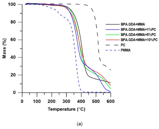 As can be seen based on the shape of the DTG curves, the thermal decomposition of the obtained blends occurs in several stages. In the case of BPA.GDA-based materials, thermal decomposition takes place in two steps. The first stage (Tmax in the range 374–391 °C corresponding to 73–75% of mass loss) is probably responsible for the distribution of fragments of the material composed of MMA and BPA.GDA, while the second peak (Tmax in the range of 536–567 °C, corresponding to 16–26% of mass loss) is responsible mainly for the decomposition of the PC contained in the obtained blends. With the increasing addition of PC, the intensity of the peaks in the DTG curve at Tmax was reduced, while an increasing amount of solid precipitates is observed after decomposition (except materials without PC). It is difficult to provide a clear explanation for the results, since the distribution of multi-component materials, including the polymer blend, strongly influences the interfacial specific interactions.