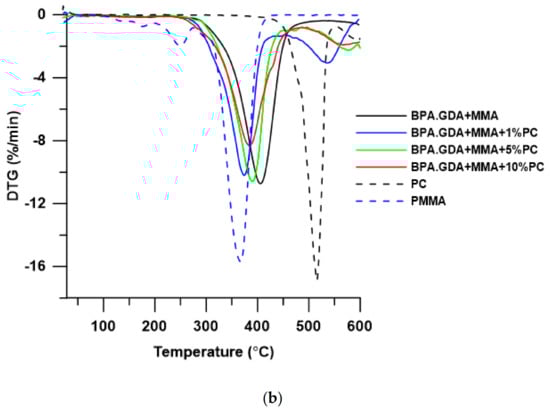 TG (a) and DTG (b) curves of BPA.GDA + MMA based blends.