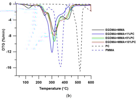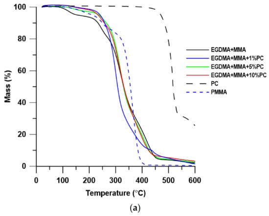 For the EGDMA + MMA-based blends, the TG curves are characterized by a similar course. Nevertheless, there are significant differences in the onset of decomposition of polymeric blends. The addition of PC has a positive effect on the thermal resistance of materials. In the case of EGDMA + MMA polymer, the loss of 5% mass is at 157 °C, after the addition of even 1 wt.% of PC the temperature increases up to 241 °C. In all cases, the TG curve shows no clear mass loss related to the decomposition of the PC addition to the matrix. When analyzing the shape of TG and DTG curves, the decomposition of EGDMA-MMA blends proceeded in several stages. The first stage (Tmax in the range of 121–137 °C corresponding to 2–3% of mass loss) may be related to the evaporation of residual solvents, moisture and unreacted monomers [38,39]. Subsequent maxima of the rate of mass loss (i.e., Tmax = 245–258 °C with 7–12% of mass loss and Tmax = 301–320 °C with 55–64% of mass loss) are probably responsible for the degradation of EGDMA, while the maximum rate of mass loss at Tmax (temperature range of 396–442 °C and 19–27% of mass loss) is related to the distribution of the fragments derived from MMA.
