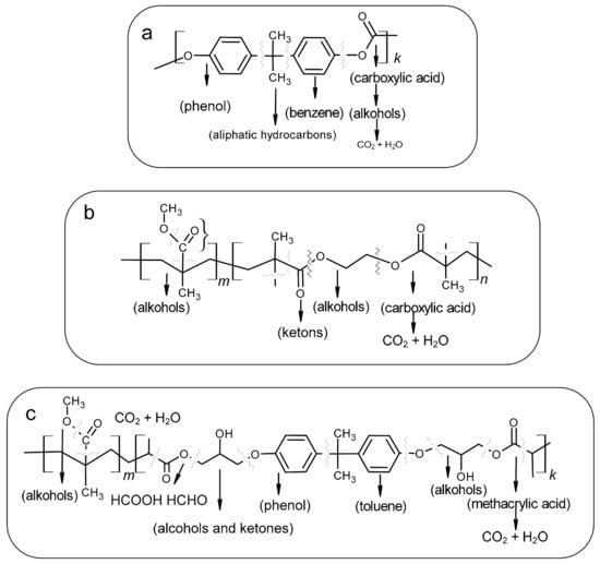 Proposed mechanisms of polymer fragmentation under heating: (a) polycarbonate, (b) EGDMA-MMA copolymers, (c) BPA.GDA-MMA copolymers.