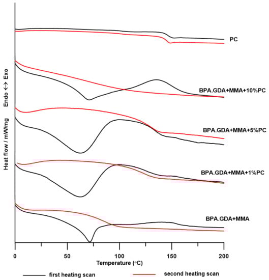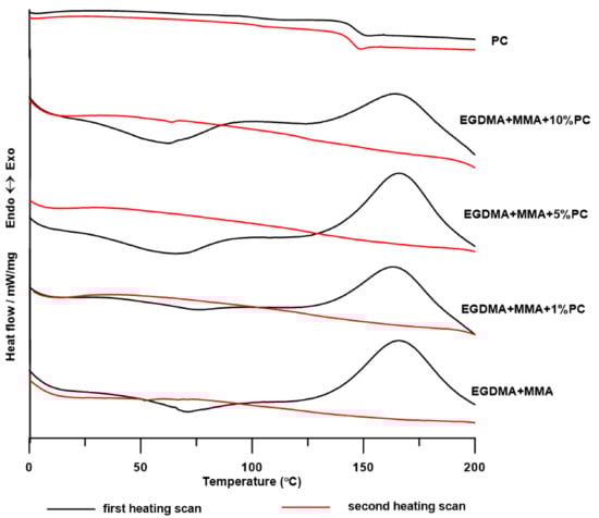 As can be seen in both graphs, the DSC curves from the first heating cycle reveal both endo- and exothermic changes. Endothermic peaks (with Tm in the range of 62–72 °C) are responsible for the melting of the crystalline form of PMMA, the abnormal formation of which for blends with 30 wt.% PMMA content has already been noticed by Faria and Moreira [42]. This conversion is irreversible, no crystallization of PMMA occurs during cooling and no crystallite melting peaks are observed in the second course of heating. The heat capacity of these transformations for the BPA.GDA blend series decreases with the increasing amount of PC in the material, while for the EGDMA blends the trend is reversed. As shown in the literature, the Tg of pure PMMA ranges from 104 to 122 °C and depends on the molar mass of the obtained polymer [38,42,43], while the Tm of the PMMA is approximately 72 °C [44]. The broad exothermic peaks (in fact it is a change in slope of curve that comes from an endothermic peak with Trecryst at 101 and 107 °C) for BPA.GDA + MMA + 1% PC and BPA.GDA + MMA + 5% PC blends are responsible for the recrystallization of PMMA crystallites or with polymorphic changes in the crystal structure. The exothermic peaks for other materials (BPA.GDA + MMA and BPA.GDA + MMA + 10% PC) at Tp in the range of 136–166 °C are responsible for the cross-linking of materials. The energy effects of cross-linking EGDMA-based blends are higher than those of BPA.GDA and it decreases with increasing PC content in the material. This may be due to the fact that the increasing number of PC chains causes the material to become more rigid, so access to unreacted methacrylic groups is limited. The DSC curves from the second heating do not reveal exo- and endothermic changes (which indicates that the materials are amorphous), while the glass transitions can be clearly seen only for blends BPA.GDA MMA + 1% PC, BPA.GDA + MMA + 5% PC. DSC analysis performed for PC showed that it was amorphous material (on the DSC curves there is no exo- and endothermic peaks) characterized by a Tg of 146 °C.