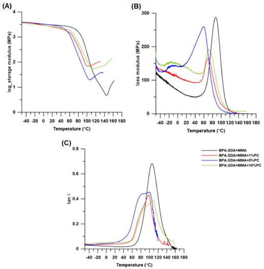 DMA curves for BPA.GDA + MMA blends: Storage modulus (E’) (A), loss modulus (E’’) (B) and damping factor (tan δ) (C).