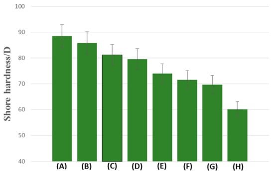 The Shore hardness of: EGDMA + MMA (A), EGDMA + MMA + 1% PC (B), EGDMA + MMA + 5% PC (C), EGDMA + MMA + 10% PC (D), BPA.GDA + MMA (E), BPA.GDA + MMA + 1% PC (F), BPA.GDA + MMA + 5% PC (G) and BPA.GDA + MMA + 10% PC (H).