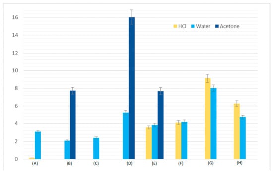Swelling charts. (A) BPA + MMA, (B) BPA + MMA +1 %PC, (C) BPA + MMA + 5%PC, (D) BPA + MMA + 10%PC, (E) EGDMA + MMA, (F) EGDMA + MMA + 1%PC, (G) EGDMA + MMA + 5%PC, (H) EGDMA + MMA + 10%PC.