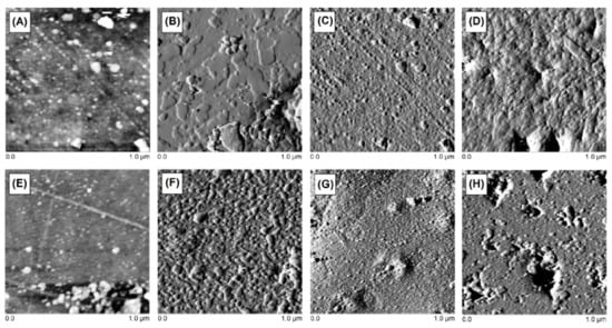 The images of samples were obtained using an atomic force microscopy (AFM)—Analytical Laboratory, Faculty of Chemistry, UMCS, Lublin, Poland). All measurements in the tapping operation modes were carried out using a NanoScope V AFM (Veeco, New York City, NY, USA) equipped with the NanoScope 8.10 software (Bruker Corporation, Germany). A rectangular Si cantilever/tip (Veeco, New York City, NY, USA) with a spring constant of 20–80 N/m and resonance frequency of 300 kHz was used. The resolution of the scans obtained was equal to 256 × 256 pixels. The topography and peak force error images were obtained simultaneously. The data were analyzed using the Nanoscope Analysis ver. 1.40 software (Veeco, New York City, NY, USA).