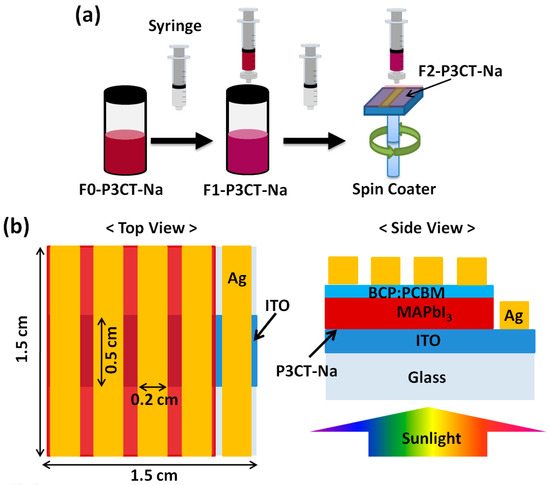 P3CT-Na/water solution was prepared through the chemical reaction of poly[3 -(4-carboxybutyl)thiophene-2,5-diyl] (P3CT) (regioregularity of 86%, Rieke, Auburn, INdia) with dry NaOH (99.99%, Alfa Aesar, Haverhill, MA, USA). 9 mg P3CT and 1.947 mg NaOH were added in to a 4.5 mL deionized (DI) water and a 0.987 mL DI water, respectively. To increase the dissolving ability of P3CT polymers in water, the solution was treated by ultrasonic treatment for 30 min. The NaOH/water solution was slowly added into the dark purple P3CT/water solution in order to minimize the thermal effects from the exothermic interaction. Then, the mixture of P3CT/water and NaOH/water was stirred at 40 °C for 6 h. After the chemical interaction, the estimated concentration of P3CT-Na/water is about 1.54 mg/mL. CH3NH3PbI3 (MAPbI3) precursors were prepared by dissolving MAI transparent crystals (0.2384 mg) and PbI2 brown powders (0.6915 mg) in a 1-mL Dimethylformmamide (DMF)/dimethyl sulfoxide (DMSO) mixture (9:1, v/v), which resulted in a 1.5 M MAPbI3 precursor solution. A total of 10 mg (6,6)-PhenylC61butyricacidmethylester (PCBM) powder (99.5%, Uni-Onward, Taipei City, Taiwan) was dissolved in a 0.5-mL chlorobenzene (CB). 0.01-mg bathocuproine (BCP) power (99%, Seedchem, Camberwell, Austalia) was dissolved in a 0.5 mL isopropanol (IPA) (99.5%, ACROS, Fisher Scientific, Waltham, MA, USA). The MAPbI3 precursor solution, PCBM/CB solution (2 wt.%) and BCP/IPA (0.05 wt.%) solutions were stirred at 400 rpm for 4 h under room temperatures.