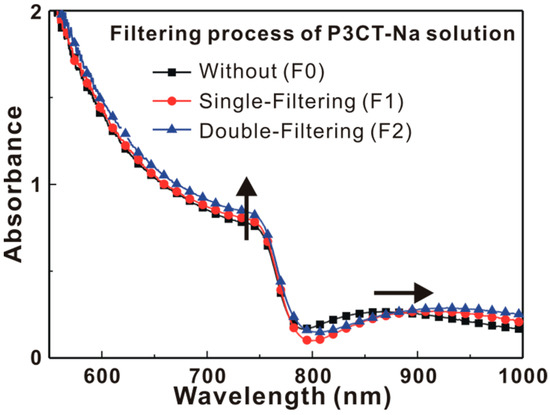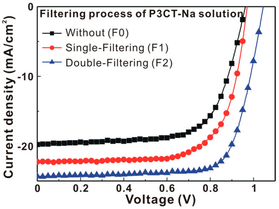 The photovoltaic performance of perovskite solar cells has satisfied the requirements for commercialization, which can provide the power conversion efficiencies (PCE) of 25.5% [1] and 22.3% [2] when the regular-type and inverted-type device architectures are used, respectively. In regular-type perovskite solar cells, TiO2 and SnO2 thin films are widely used as the electron transport layer (ETL) to collect (block) the photo-generated electrons (holes) from the perovskite thin film. The formation of high-quality n-type inorganic materials always requires a high-temperature annealing process. For example, the sintering temperature of anatase TiO2 is about 450 °C [3], which can damage plastic substrates and thereby impeding the application in flexible optoelectronic devices. In inverted-type perovskite solar cells, poly(3,4-ethylenedioxythiophene):polystyrenesolfonate (PEDOT:PSS) thin films are widely used as the hole transport layer (HTL) to collect (block) the photo-generated holes (electrons) from the perovskite thin film. Fortunately, PEDOT:PSS thin films can be fabricated by using various solution process methods under low temperatures (<120 °C). Besides, it is naturally to form a smooth contact between the hydrophilic PEDOT:PSS and perovskite thin films, which results in a high-efficiency hole collection and thereby contributing to the generation of photocurrent [4]. However, the Fermi level of PEDOT:PSS thin films is ranging from 5 to 5.1 eV [5,6,7], which results in a relatively low open-circuit voltage (VOC) from 0.85 to 0.95 V [8,9,10]. Wide-bandgap p-type NiOx and CuOx thin films were used to replace PEDOT:PSS thin films as the HTL of inverted-type perovskite solar cells, which results in the higher VOC. However, the short-circuit current density (JSC) of the resultant perovskite solar cells is lower than 22.5 mA/cm2 [11,12,13,14] due to the lower hole-collection efficiency from the perovskite thin film to the inorganic HTL. In recent years, the poly [3-(4-carboxybutyl)thiophene-2,5-diyl] (P3CT) based thin films are also used as the efficient HTL in inverted-type perovskite solar cells [15,16,17,18]. The P3CT based polymers have hydrophilic side chains, which can be partially dissolved in water solutions. Therefore, the spin-coating method can be used to fabricate P3CT based thin films on top of the ITO/glass or ITO/PET substrate with a post thermal annealing process under low temperatures. The use of an ultra-thin P3CT-X (X: Na+, K+, Rb+, Cs+, or CH3NH3+) film can be considered as the modification layer on top of the conductive ITO, which modifies the work function of the transparent electrode to efficiently collect the photo-generated holes from the perovskite thin film. It is noted that the VOC and JSC of the P3CT-X based perovskite solar cells can be higher than 1.05 V and 24 mA/cm2, respectively. However, the formation of large-scale and ultrathin P3CT-X films was not investigated in literatures [15,16,17,18]. It gives the reason to investigate the relation between the morphology of the P3CT-X thin films and the photovoltaic performance of the resultant perovskite solar cells. Our main goal is to form a large-scale and ultrathin P3CT-X interlayer for the realization of high-efficiency inverted-type perovskite solar cells. The experimental results show that the high-efficiency perovskite solar cells rely on the use of a double-filtering method for the P3CT-Na solution. A high PCE of 19.03% was achieved in the inverted-type perovskite solar cells when the double-filtering process of P3CT-Na solution is used to modify the molecular packing structure of the HTL. On the other hand, it is predicted that the double-filtering method can be readily used to increase the PCE of polymer based solar cells [19,20].