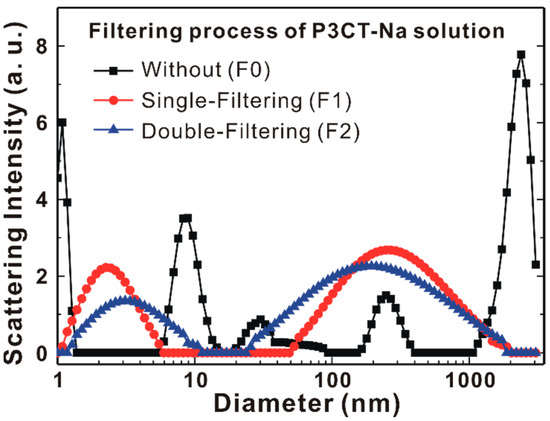 Figure 3 presents the particle diameter dependent electrophoretic light scattering intensity of the different P3CT-Na water solutions. Without the filtering process, the particle diameters of the aggregated P3CT polymers have the most diverse distributions from 1 nm to 2.4 μm, which means that the resultant P3CT thin film on top of the ITO/glass substrate can contain micrometer-sized P3CT-Na aggregates. When the single-filtering process (F1) is used to remove the micrometer-sized P3CT-Na aggregates with a hydrophilic polyvinyl difluoride (PVDF) syringe filter (0.45 μm pore), the diverse particle diameters of the aggregated P3CT polymers are reduced to 2.3 and 254 nm. It can be understood that the micrometer-sized P3CT-Na aggregates (isolated P3CT-Na polymers) are broken up (packed together) after the single-filtering process. After the double-filtering process (F2), the distributions of the nanometer-sized P3CT-Na aggregates and sub-micrometer-sized P3CT-Na aggregates both become broader. It is noted that the diameter of the nanometer-sized P3CT-Na aggregates increased from 2.3 to 3.5 nm, which is close to the optimal thickness of the P3CT-Na thin film as the HTL of perovskite solar cells [15].
