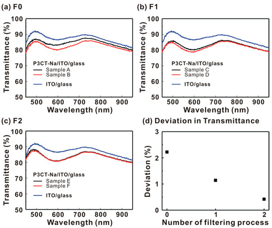 Transmittance spectra of P3CT-Na/ITO/glass substrates. (a) Without filter; (b) With single-filtering process; (c) With double-filtering process. (d) Averaged deviation in transmittance spectra from 450 to 650 nm.
