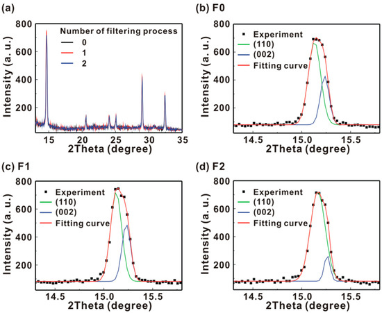 (a) X-ray diffraction patterns of the MAPbI3/P3CT-Na/ITO/glass samples. Main diffraction peaks of the MAPbI3 thin films at (110) and (002): (b) without filtering process; (c) single-filtering process; (d) double-filtering process.