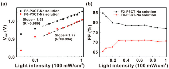 To explore the sunlight-generated carrier dynamics in the P3CT-Na based MAPbI3 solar cells, the light intensity-dependent VOC and FF are measured from 5 to 100 mW/cm2, as shown in Figure 9. The slope (S) in Figure 9a can be used to evaluate the non-radiative recombination rate of the photo-excited carriers. The Koster equation [28,29,30] can be used to determine the slope: