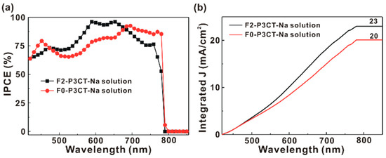 To investigate the wavelength-dependent photovoltaic performance, the J-V curves of the P3CT-Na based MAPbI3 solar cells are measured under the different excitation wavelengths from 420 to 850 nm at a fixed light intensity of 4 mW. Figure 10a presents the incident photon-to-current conversion efficiency (IPCE) spectra of the P3CT-Na based MAPbI3 solar cells fabricated with and without the double-filtering process for the P3CT-Na solution. The IPCE values are calculated from the measured JSC with the simple relation: