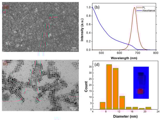 (a) SEM image and (b) absorbance and photoluminescence (PL) spectra of CsPbI3 QDs spun on glass substrates. (c) TEM image and (d) size distribution of CsPbI3 QDs evaluated by (c). The inset shows the CsPbI3 QDs dispersed in octane and excited under UV light at 365 nm.