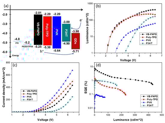 (a) Energy levels for different HTLs, (b) luminance-voltage (L-V), (c) current density-voltage (J-V) and (d) external quantum efficiency (EQE) for IPQLED devices with different HTLs.