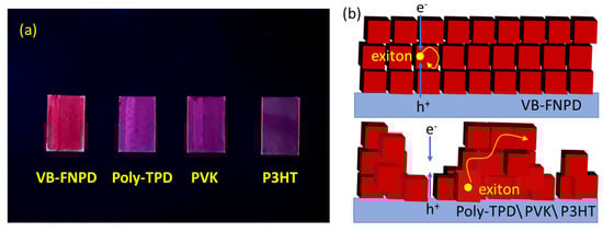 In fact, the determination of the carrier recombination efficiency can be easily observed by the naked eye. Figure 3a shows the photograph of CsPbI3 QDs films spun on each HTL, in which the VB-FNPD film shows brighter than others. The thicknesses of all QDs films were around 40 nm, measured by Alpha–Step. Hence, the brightness of the QD solids should be attributed to the degree of the aggregation on the different HTL surfaces, rather than the film thickness. When the well-organized array of the colloidal CsPbI3 QDs is formed on the surface of the VB-FNPD films without the QD aggregations, the light-induced exciton is limited in a QD nanoparticle to increase the quantum confinement effect, resulting in the improved radiative recombination, as illustrated in Figure 3b. In contrast, the light-induced exciton can transport between nanoparticles, due to the QD aggregations, leading to the increased dissociation possibility of the exciton prior to its radiative decay [,]. It is the reason why the brightness of VB-FNPD film is much stronger than that of other films, which is in good agreement with the device results (Figure 2d). The summary of PLQYs for CsPbI3 QDs layers spun on different HTLs are listed in Table 1. The PLQY of CsPbI3 QDs layer on the glass is higher than the PLQY of those spun on each HTL, which may be because the exciton dissociation is suppressed at the insulated glass []. On the other hand, the full-coverage QD films confirm the carrier combination. The films with the QD aggregations provide a leakage path, which is the reason that the current in the Poly-TPD device is higher than that in the VB-FNPD device (Figure 2c). The best performance of 7.28% was achieved in the VB-FNPD device.