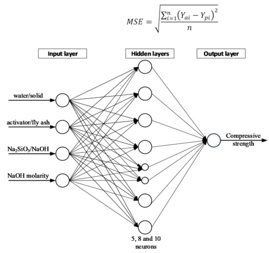 Despite the past research on performance and mix design parameters of high calcium fly ash in geopolymers, there is no widely accepted procedure to determine the proportions to be mixed in concrete. Optimization by artificial intelligence tools with different algorithms [,] has been used for the mix design of PC concrete. The artificial neural networks (ANN) technique was used for alkali-activated concrete and found that compressive strength can be predicted with minimal error in comparison to the experimental results [,,]. ANN is a statistical data modelling tool that can be trained using the available data as inputs by changing the weights with the aim to model a complex relationship between the inputs and the target outcome [,]. Lahoti et al. [] investigated the effect of four influential ratios (Si/Al molar, water/solid, Al/Na molar H2O/Na2O molar) using ANN to predict the compressive strength of alkali-activated metakaolin concrete. In another study [], ANN models with different numbers of neurons in hidden layers were investigated and predicted the compressive range of strength of alkali-activated concretes based on curing time, CaO content, NaOH concentration, and H2O/Na2O molar ratio. Researchers have been attempting to optimise the layers by using different functions for the hidden and output layers []. Ling et al. [] showed a strong correlation between the ANN model predictions and the experimental results for compressive strength and setting time of high calcium fly ash geopolymer concrete.