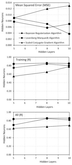 Figure 1 shows the ANN model construction: the 4 input variables as 4 influential parameters; the 5, 8 and 10 neurons were selected for the hidden layer; and the compressive strength was selected as the only target output. Having developed the ANN model and trained it using the training data set, next step was to evaluate the model using the testing data set. The coefficient of correlation (R) and mean square error (MSE), Equations (3) and (4) [] were used as performance parameters in this study. In these equations, “Y” represents the compressive strength at 28 days, the “a” and “p” denote the actual and the predicted, a bar above the letter shows the mean value, and sample size if given by n.
