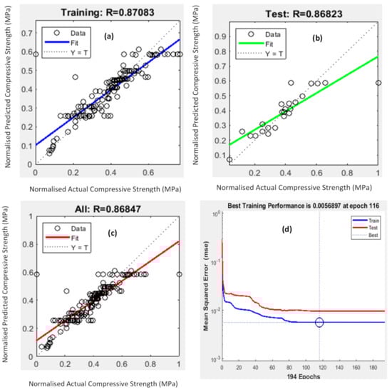 The model performance with 8 hidden neurons along with the Bayesian Regularization algorithm is shown in Figure 3. When data points sit on the dotted straight line, it confirms the exact correlation between the predicted and compressive strength from experimental results, which is the desired outcome. It was observed that the training dataset had the best correlation with the normalised actual compressive strength when compared to the test and all plots. In addition, all three scatter plots yielded R values greater than 0.8, which meant a close relationship existed between the key mix design parameters and the 28-day compressive strength. The ANN model with the selected neurons and the algorithm had a MSE value of 0.0056897, closest to zero, confirming there was almost no error present in this predictive model.