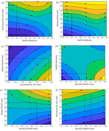 The contour plots shown in Figure 4 demonstrate the intercorrelation of the selected four input variables (water/solid ratio, activator/fly ash ratio, Na2SiO3/NaOH ratio and NaOH molarity) with the target output of compressive strength. Hence, these contour maps can be used to design mix proportions for a target 28-day compressive strength for high calcium fly ash geopolymer concrete.