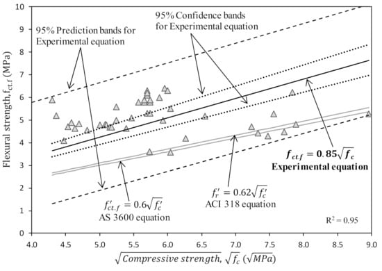 The Ypred. is the predicted Y values, t0.05 is the t critical value for 95% interval, n is the sample size, X is the true value while is the mean of sample and SSx is the sum of the squares of standard error of X values. The proposed regression model for the relationship between compressive and flexural strength is shown in Figure 5. Relevant equations are available in the Standards [,] for Portland cement concrete to evaluate the flexural strength which are used in deflection calculations. However, these equations do not lie in the 95% prediction interval bands of the regression model for experimental results. The AS 3600 [] and ACI 318 [] equations for flexural strength are on the lower side of the confidence interval of the proposed regression model, illustrating that the design equations of both standards underestimate the flexural strength for high calcium fly ash geopolymer concrete. Hence, the use of the current standard/code for PC concrete will achieve a conservative design for flexural members made with high calcium fly ash based geopolymer concrete.