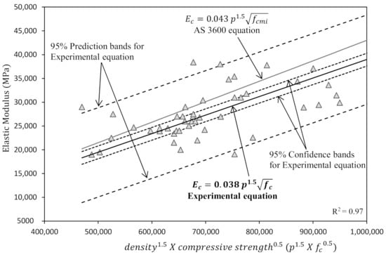 A linear regression line with prediction and confidence interval bands to demonstrate the relationship between compressive strength and elastic modulus is shown in Figure 6. As the R2 value of the regression model was 0.97, this indicates that a more accurate modulus of elasticity could be achieved if the density was also considered in the equation. AS 3600 [] and ACI 318 [] also provide a similar design equation with the inclusion of density. Contrary to the flexural strength, the AS 3600 equation for elastic modulus lies above the upper confidence interval of proposed regression model. This implies that the available equations for PC concrete overestimate the elastic modulus of high calcium fly ash geopolymer concrete which leads to an underestimation of serviceability performance.